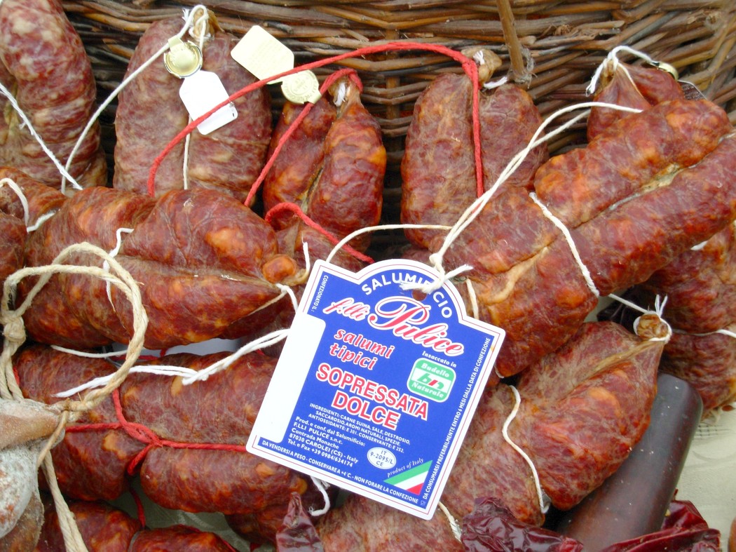 La sopressata è uno dei salumi più pregiati del panorama gastronomico calabrese. L’impasto della carne, tritata a medio taglio, è ricavato dal prosciutto e dal lombo dei suini con l’aggiunta di pancetta di prima scelta che ne conferisce la morbidezza. Prodotta senza glutine e derivati del latte. la sopressata viene aromatizzata con peperoncino calabrese, da cui ne trae il gusto intenso e deciso, insaccata in budella naturali di suino, forate e quindi legate a mano con spago naturale. La sopressata può essere insaccata nel budello gentile, un budello più spesso di quelli normalmente usati che allunga la stagionatura ma che esalta ancor di più la bontà del prodotto.